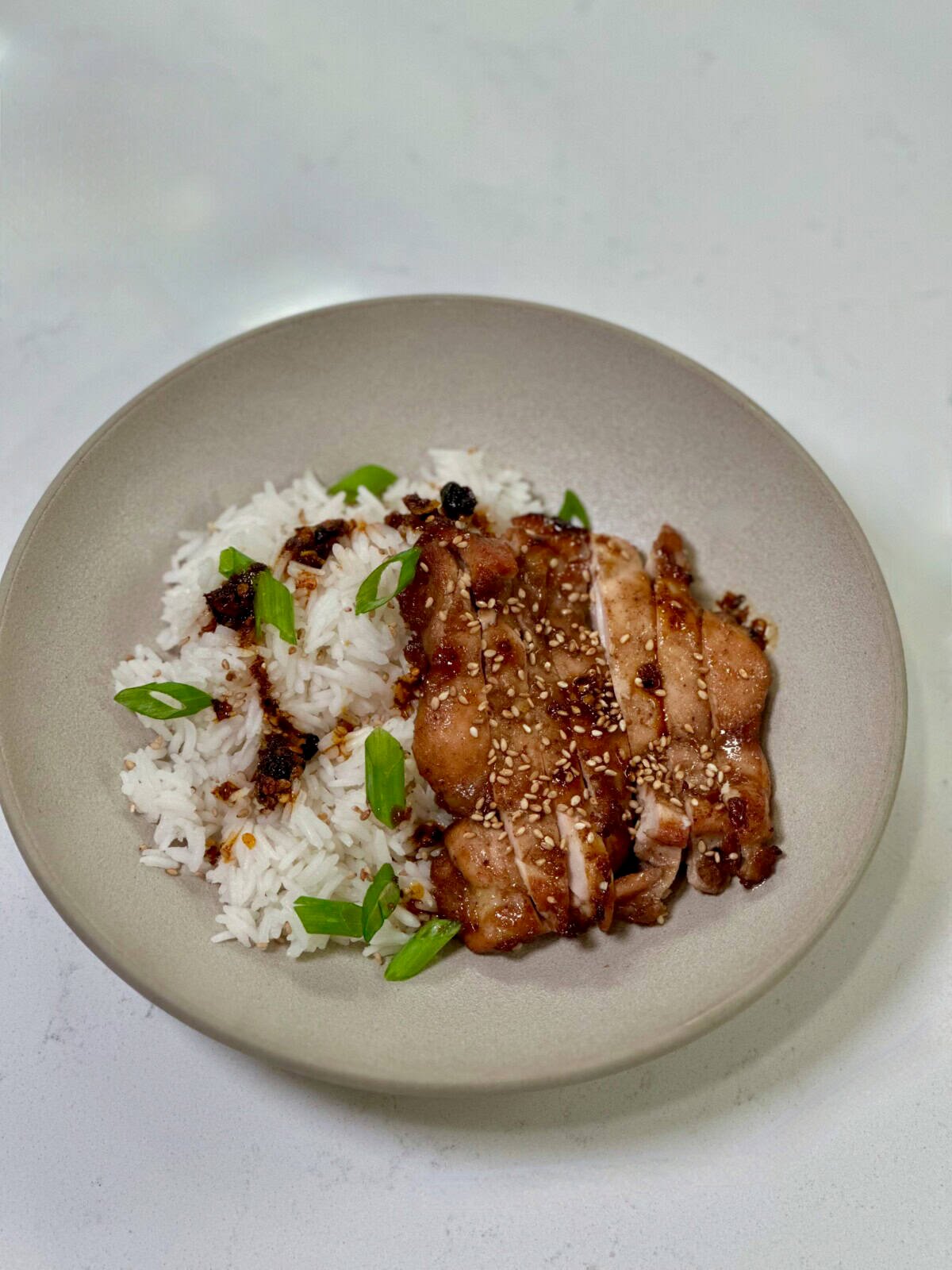 After marinating the chicken, place it on a baking sheet, bake, and dinner is READY! I enjoyed slicing up the chicken into thin strips and serving with steamed white rice.