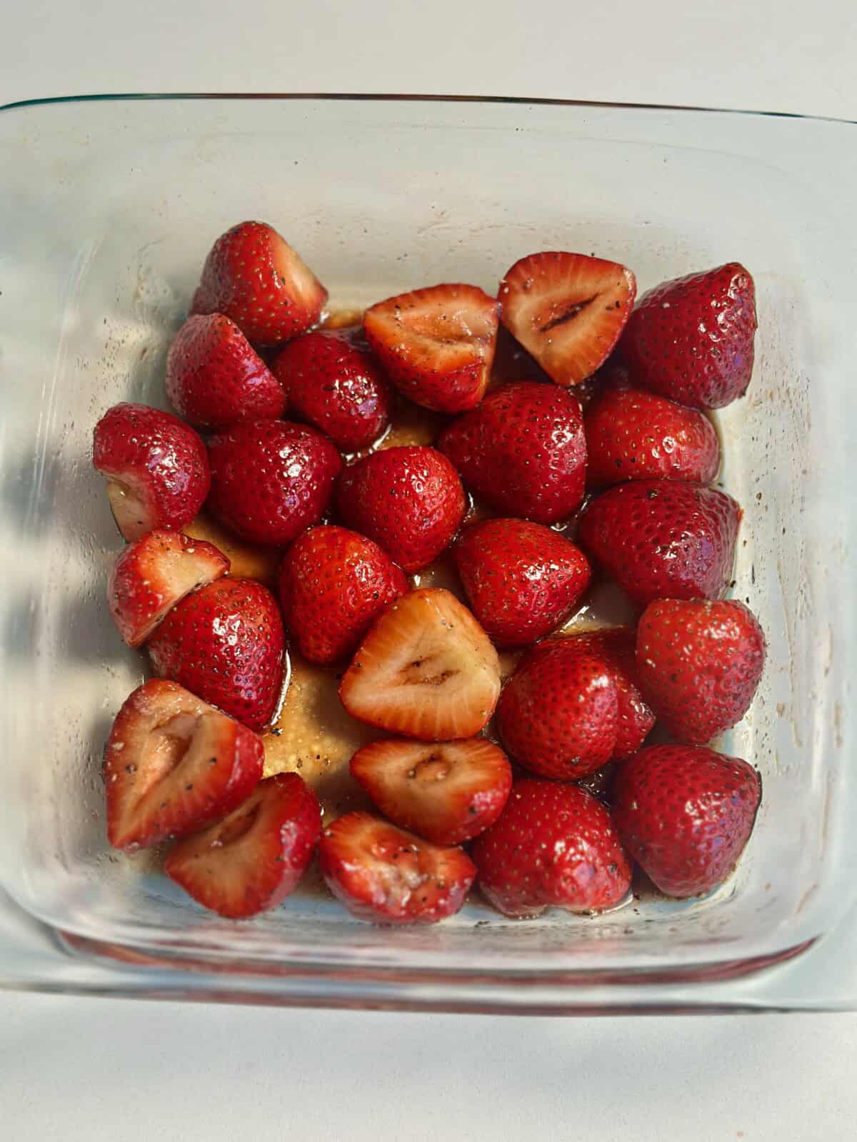 - Toss the strawberries with balsamic, olive oil, salt, and pepper.