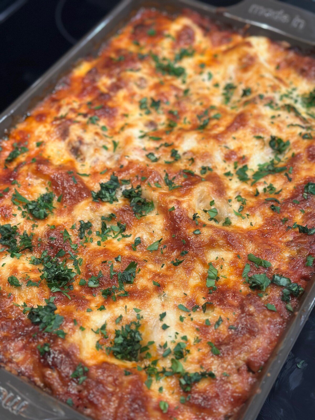 - Remove from the oven and let the lasagna rest for 20 minutes before slicing into 12 pieces. Optionally, garnish with fresh parsley, basil, and parmesan cheese before serving.