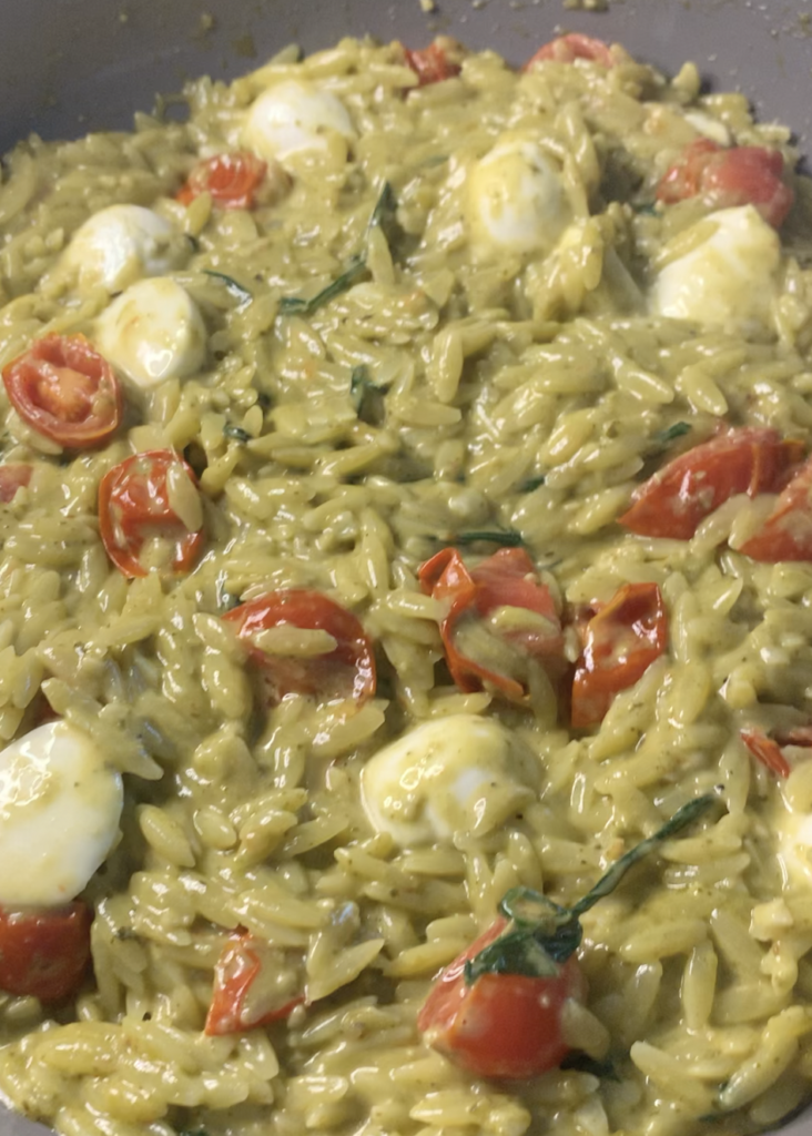 - Once the orzo is cooked and most of the liquid is absorbed, add the sliced cherry tomatoes and chiffonade fresh basil. Stir to combine. Mix in the basil pesto until well combined. Add the sliced fresh mozzarella balls. Stir to combine.