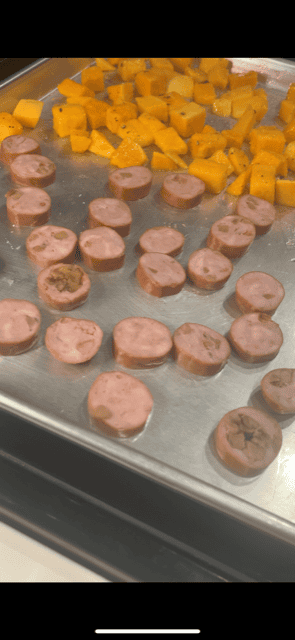 - Slice chicken sausage and place on the other side of the baking sheet. Bake the squash and sausage for 30 minutes.