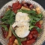 Meanwhile, cook the rigatoni according to package instructions. Drain and add to a large bowl or back to the pot you cooked the pasta in. When the tomatoes are done roasting, add them straight to the cooked pasta. Add another 1/4 tsp of oregano and red pepper flakes.
